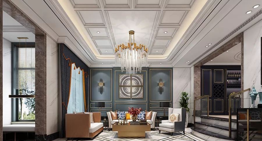 客廳浪漫又不失溫馨的造型,高品質的家具結合墻面大理石的紋理,再加上金屬線條的點綴,體現出現代風格的可塑性,同時又不失品質感的設計語言。整體空間使用米色和藍灰色為主色調,流蘇狀的吊燈唯美又有格調,加上暖暖的燈光,使整個空間有種輕奢高貴的感覺。