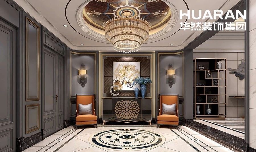 曾幾何時,對都市人來說,尋求一種自然隨性的生活是一種苛求。身處大都會的繁華,絢麗熱鬧的背后,又有多少屬于自己的空間。我們喜歡熱鬧的場景,也喜歡那安于一角欣賞繁華盛世的寧靜。玄關利用灰色調讓整個空間顯得沉穩,精致雕花的石膏線條,線條豐富的護墻板,以一種低調卻不容忽視的地位存在于空間之中。
